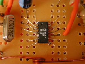 Micrf104 is in SOIC package, which is smaller than DIP package and can not be plugged on breadboard. As a result, first we glue it on a small pc board, when it is fully dried, connect metal fine wires and it's pin by soldering. It must be done very carefully because the soldering point of wire and pin is small and is very easy to short another pins. Avoid touching pins directly by soldering tip, it might burn down the chip.